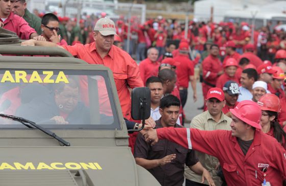 paseando por un campo petrolero, abrazando camaradas, retando a la oposición;
